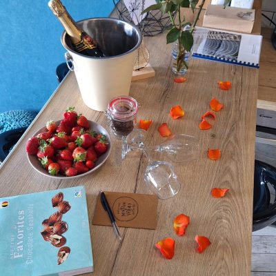 Champagne, fleurs fraîches, chocolats, fraises dans une des plus belles vues de Rennes au 26eme étage des horizons